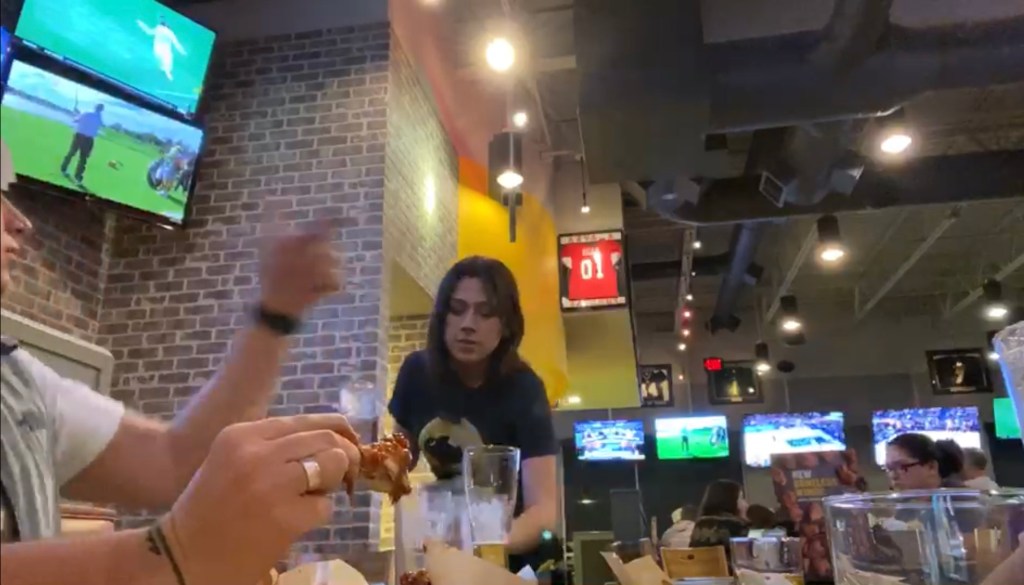 After finishing his fifth wing, Adam proudly proclaimed that he was “half way done.” Unfortunately for Adam, he was really only 16% of the way done with his 30 wings in three nights. After the first five wings, the heat began to break him. He would need help from his ‘champion’ Water Waitress: