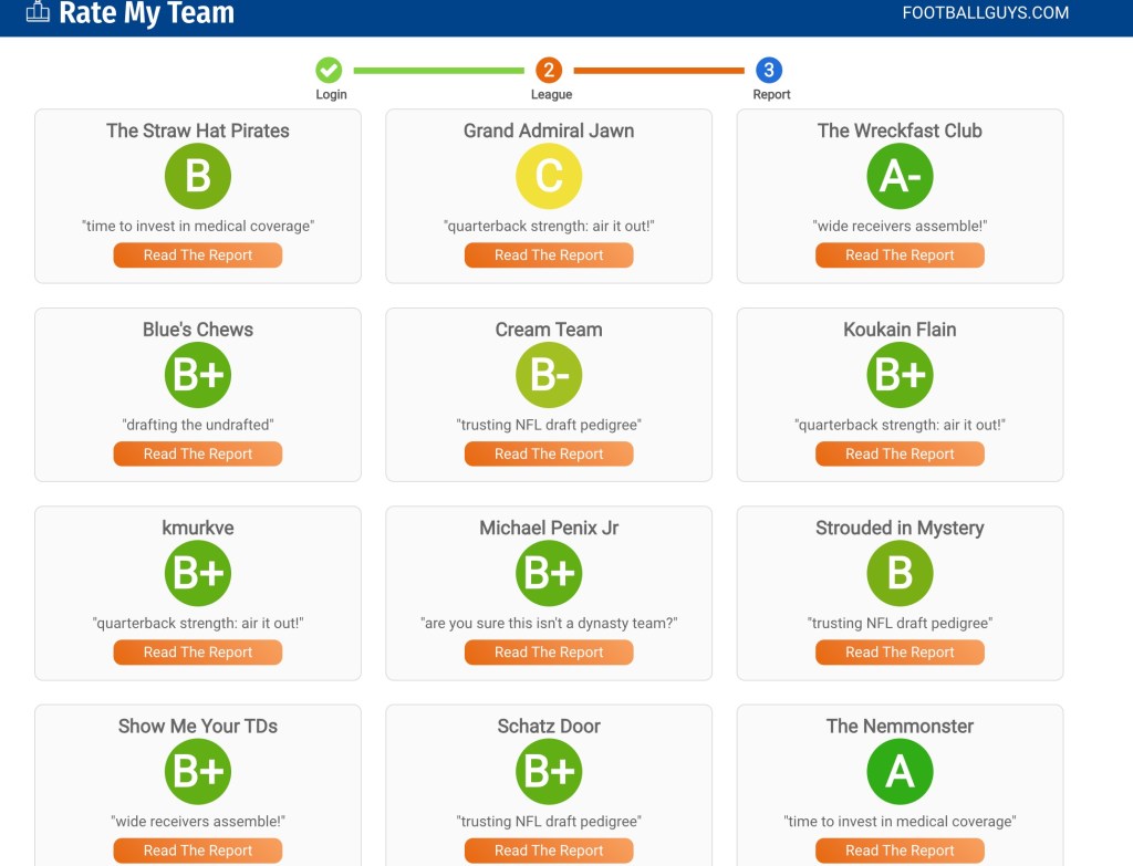 Finally, the Algorithm Needs a little bit more time to warm up. It’ll be making it’s return NEXT WEEK after Week One is finished. For now though, here’s some totally original and not at all lifted from anyone else DRAFT GRADES! Enjoy.